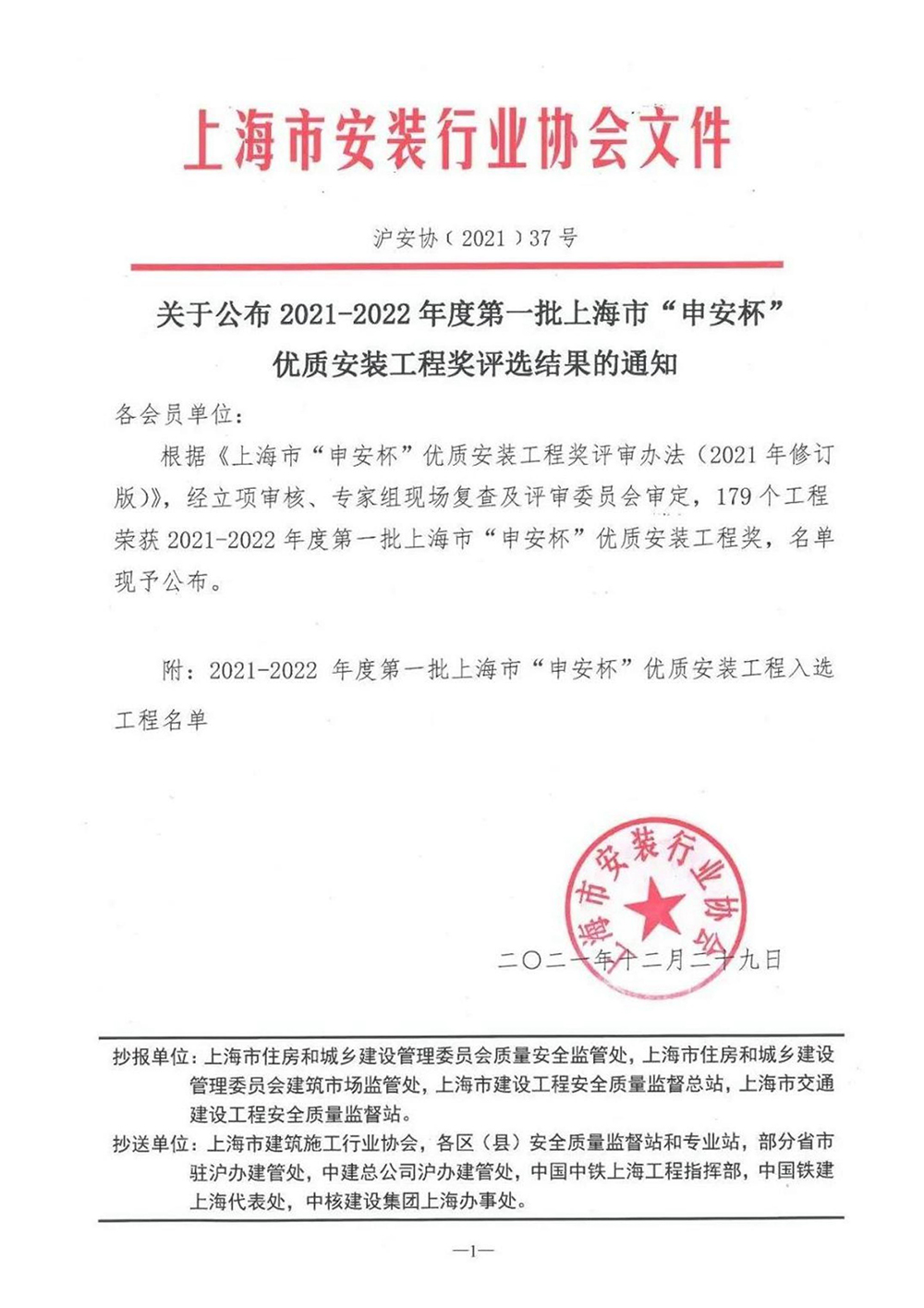 2021-2022年度第一批上海市“申安杯”优质安装星空官方站网站-星空(中国)。