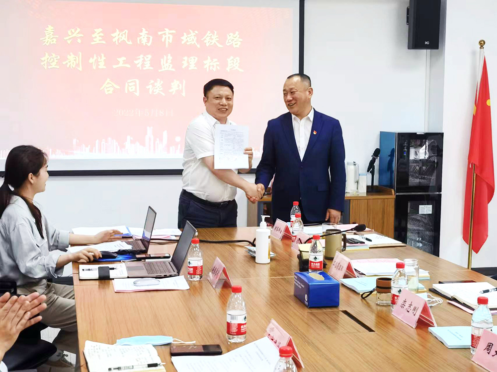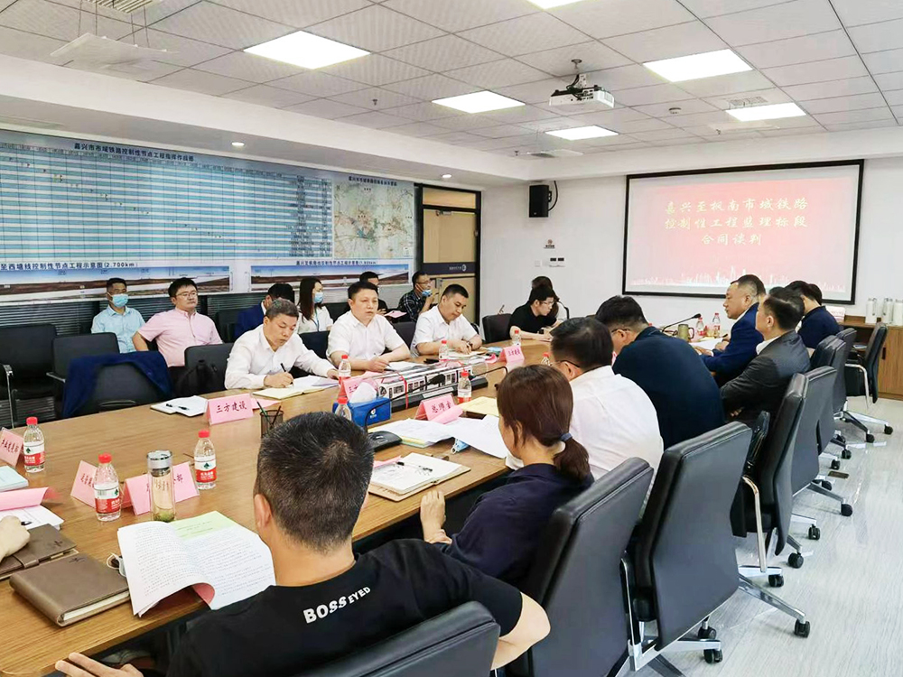 5月8日,集团董事长吴祖跃带队参加嘉兴至枫南市域铁路控制性节点星空官方站网站-星空(中国)(嘉兴南站)监理合同谈判会。会议由嘉兴市铁路与轨道交通投资集团(以下简称嘉兴铁投)组织召开,嘉兴铁投总经理周大勇、副总经理栾志刚、嘉兴市铁路指挥部徐峰平及铁投相关部室负责人参加。
