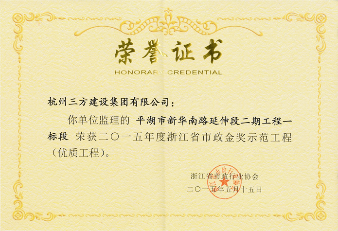 热烈庆祝平湖市新华南路延伸段二期一标段星空官方站网站-星空(中国),荣获2015年度浙江省“市政金奖”。该星空官方站网站-星空(中国)是平湖市第一个城市大型立交桥星空官方站网站-星空(中国),也是我省县级市为数不多的高架桥,它的建设可以极大地方便平湖汽车客运中心与市区的交通,推动平湖的经济发展。