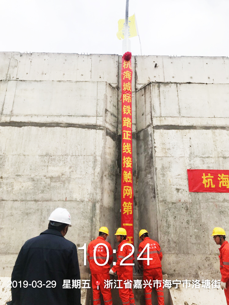 2019年3月29日上午10:08杭海城际铁路斜皮区间U型槽段,在司索工的指挥下,起重设备缓缓移动将接触网支柱稳稳地吊落在支柱基础上,杭海城际铁路正线接触网第一杆成功组立,标志着杭海城际铁路供电系统星空官方站网站-星空(中国)全面开工。