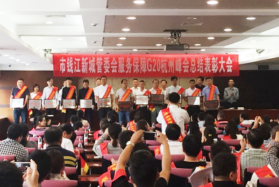 2016年10月9日,钱江新城管委会举行了隆重的表彰大会,表彰为G20峰会作出贡献的先进集体和个人,我集团和14位员工被评为先进集体和先进个人,集团总裁夏少云代表集团上台领奖。