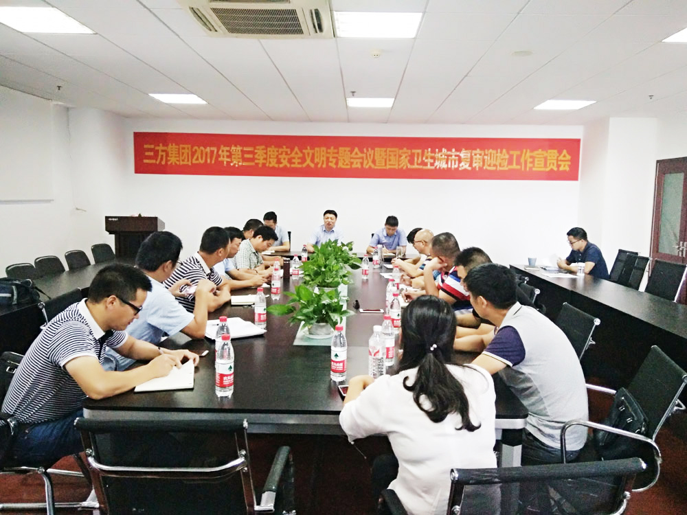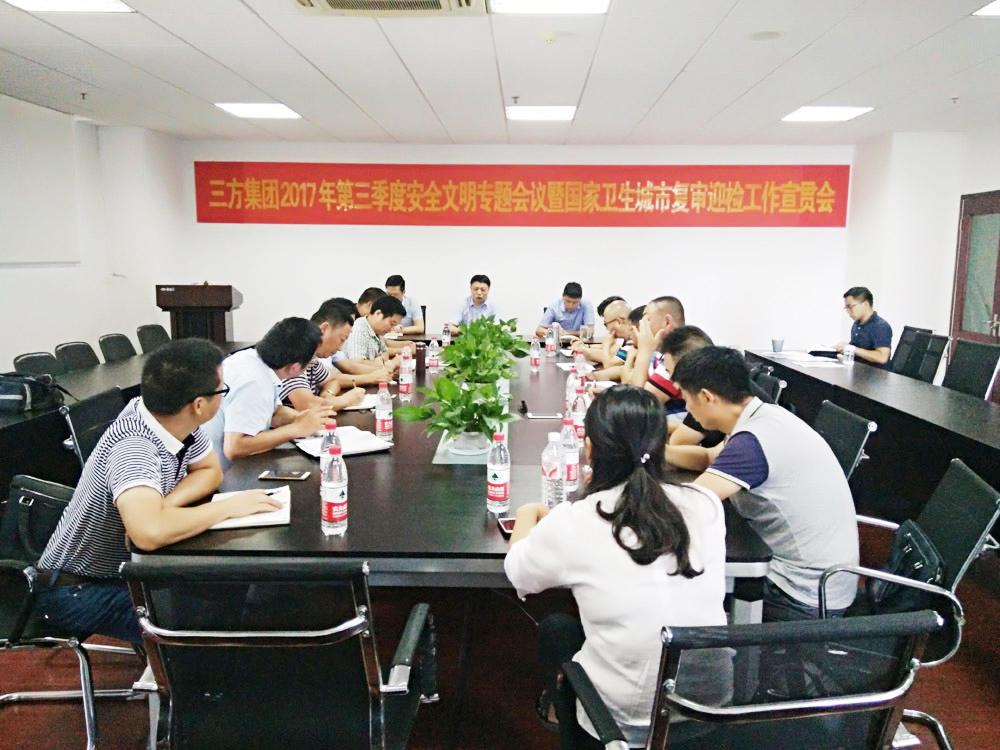 2017年8月15日下午,集团在会议室召开了“三方集团2017年第三季度安全文明专题会议暨国家卫生城市复审迎检工作宣贯会”。集团董事长、总裁、副总裁、总监(项目负责人)、合作项目负责人出席本次会议。