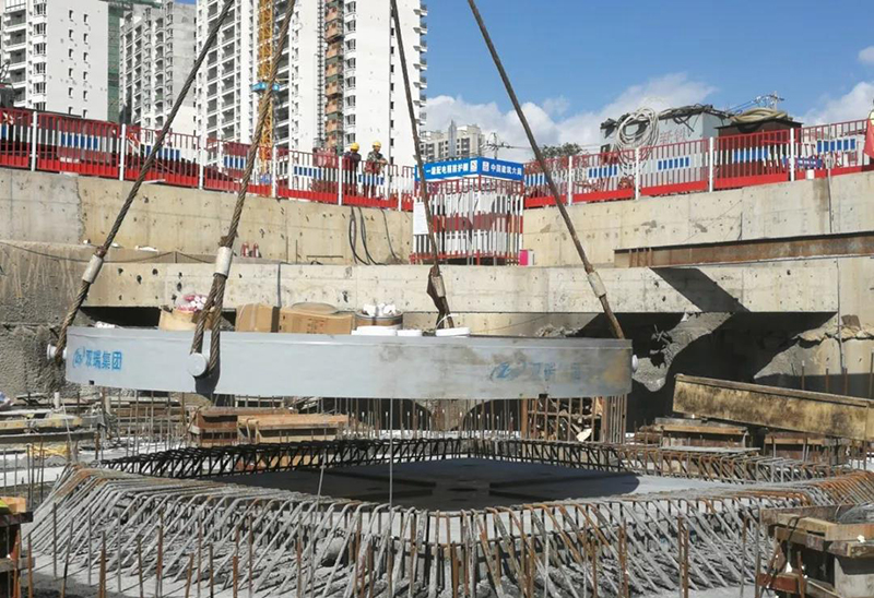 10月17日,球铰施工正式拉开帷幕。由于球铰骨架超大超宽,采取分块运输现场拼装。且基坑靠近既有铁路,为保证施工的安全性,采用高功率(350t)汽车吊进行吊装作业,顺利完成骨架预埋工作。