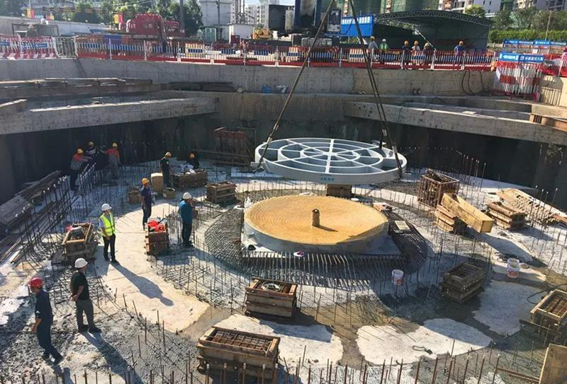 11月5日,500t汽车吊进入施工现场,开启球铰主体结构安装。下球铰重达48t,直径达5m,上含1758个滑块嵌槽,由外逐一编号。