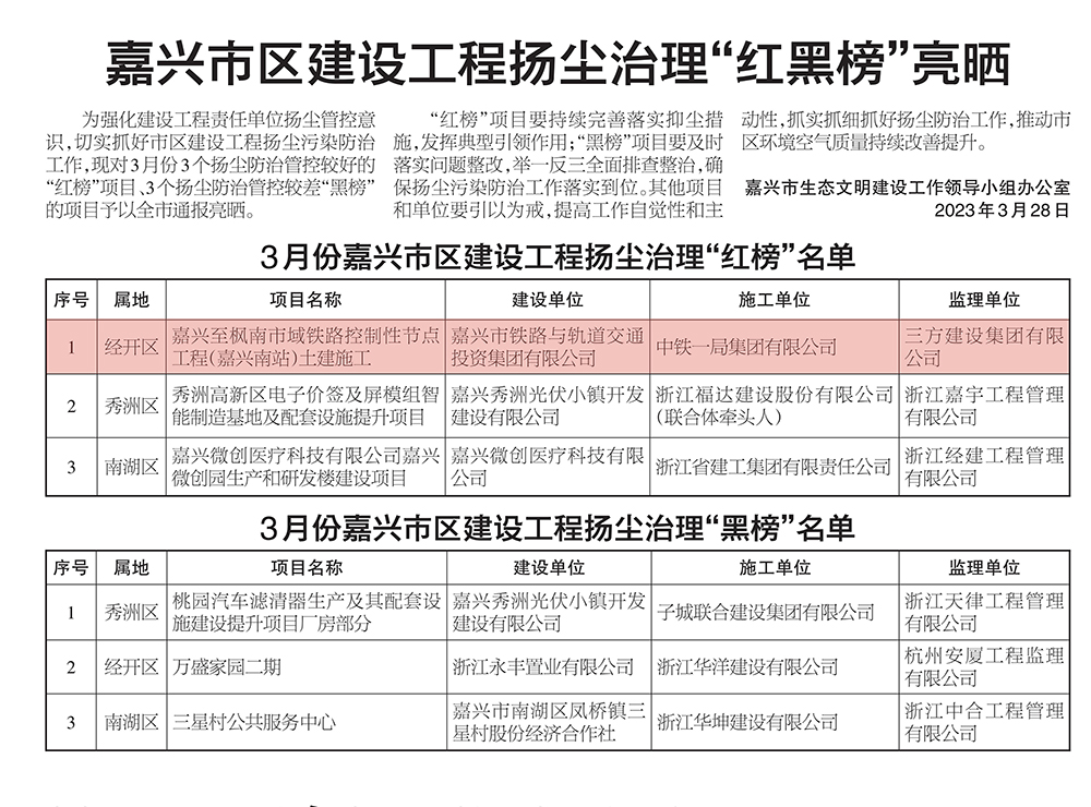 31日,《嘉兴日报》公布嘉兴市区建设星空官方站网站-星空(中国)扬尘治理“红黑榜”亮晒名单,我集团监理的嘉兴至枫南市域铁路控制性节点星空官方站网站-星空(中国)(嘉兴南站)光荣上“红榜”。该项目自去年荣登9月嘉兴市区建设星空官方站网站-星空(中国)扬尘治理“红榜”后持续完善落实抑尘措施,在嘉兴市建设星空官方站网站-星空(中国)中发挥了典型的引领作用,此次已是第二次登上“红榜”表彰名单。