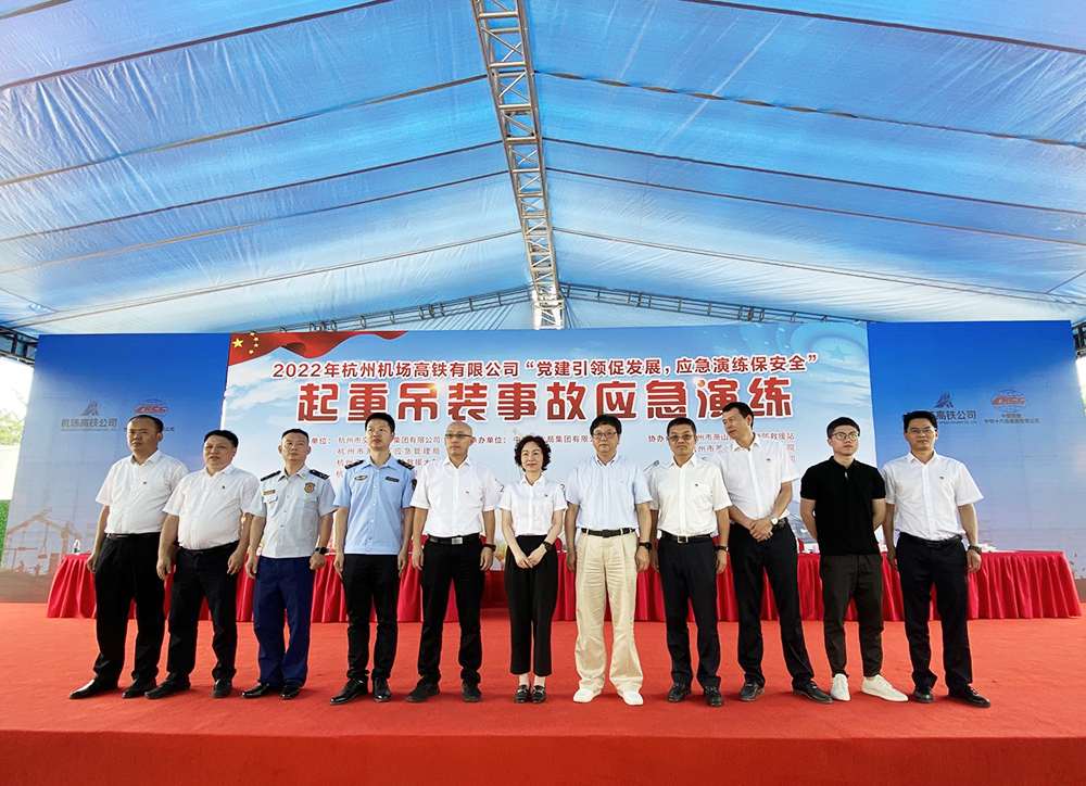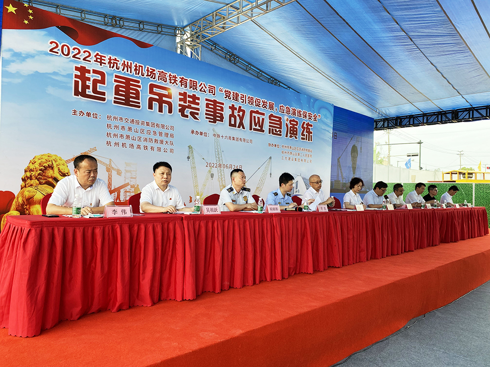 杭州机场高铁项目质量安全管理专家委员会组长、省轨道协会副会长、原沪昆客专浙江公司总经理张扬;杭州机场高铁公司董事长、总经理许敦莲;杭州交投集团安全管理部部长胡志成、轨道事业部副部长王月明;杭州市铁路建设管理中心钟耀彪;杭州市萧山区应急管理局安全生产基础科科长胡良;杭州市萧山区消防救援大队副教导员杨柿林;铁四院浙江分院院长孙敬伟;三方建设集团董事长吴祖跃;中铁十六局集团副总经理、华东区域指挥长高宪民,中铁十六局集团三公司党委书记李伟等出席演练观摩现场,各参建单位人员共计120余人参加。