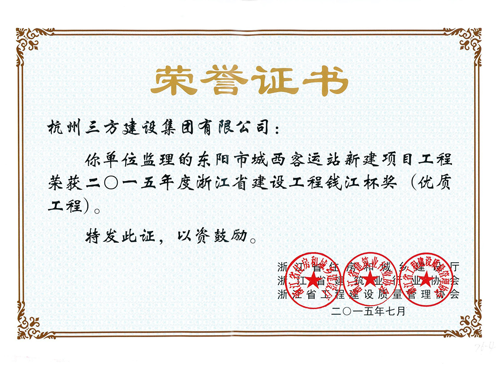 我集团监理的东阳市城西客运站新建项目、东阳市人民医院巍山分院病房综合楼星空官方站网站-星空(中国)获得浙江省优质星空官方站网站-星空(中国)“钱江杯”荣誉。
